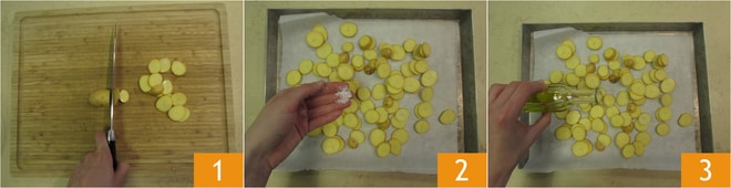 Pour préparer le risotto, lavez, séchez et coupez les pommes de terre nouvelles en rondelles d'environ 2 mm d'épaisseur 1, placez-les sur une plaque recouverte de papier cuisson et assaisonnez-les avec du sel 2 et de l'huile 3. Faites-les cuire au four préchauffé à 200 degrés pendant 30 minutes.