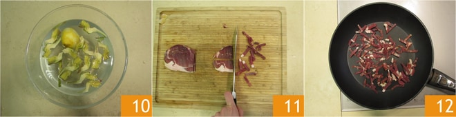 Mettez-les dans un bol avec de l'eau et du jus de citron pour éviter qu'ils ne noircissent 10. Pendant ce temps, coupez le jambon en lanières 11, mettez-le dans une poêle bien chaude 12.