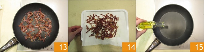 Faites-le bien dorer à feu vif. Lorsqu'il sera croustillant 13, placez-le sur une plaque avec du papier absorbant 14 et réservez-le. Chauffez un filet d'huile dans la même poêle 15