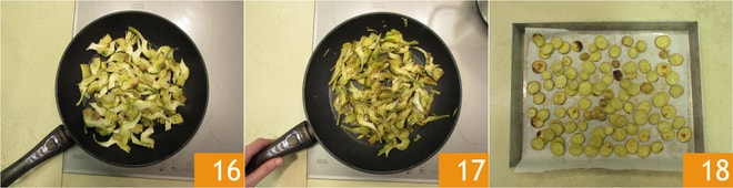 ajoutez les artichauts 16 et faites-les cuire à feu vif (cela prendra environ 6/7 minutes) et salez-les. Quand ils seront bien colorés 17 éteignez le feu et réservez-les. Entre-temps, les pommes de terre auront cuit, sortez-les du four 18 et laissez-les à température ambiante.