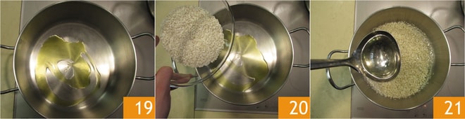 Commencez la cuisson du risotto. Dans une casserole, chauffez un filet d'huile 19, versez le riz 20 et faites-le griller pendant quelques minutes. Déglacez avec une louche de bouillon de légumes 21