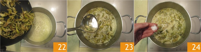 Ajoutez ¾ des artichauts, gardez les autres pour le dressage. Continuez la cuisson du riz pendant environ 15 minutes en remuant de temps en temps et en ajoutant une louche de bouillon chaque fois que le riz commence à sécher 23, salez à votre convenance 24.