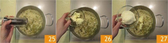 Une fois la cuisson terminée, éteignez le feu et rectifiez le sel et le poivre 25. Incorporez le beurre 26, le parmesan 27 et mélangez.