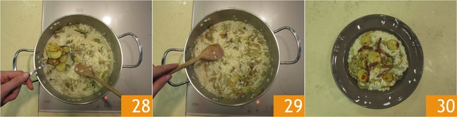 Terminez en ajoutant les pommes de terre rôties 28 et mélangez délicatement 29. Dressez votre riz et disposez dessus quelques quartiers d'artichauts, quelques rondelles de pommes de terre et le jambon croustillant. Votre risotto aux artichauts et pommes de terre est prêt à être servi bien chaud!
