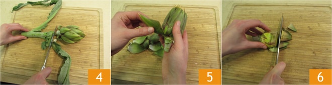 Entre-temps, nettoyez les artichauts: coupez une partie de la tige 4, enlevez les feuilles les plus extérieures 5 et la pointe 6.