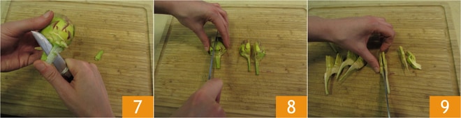 Avec un petit couteau, pelez la tige restante pour éliminer la partie extérieure la plus dure 7. Coupez les artichauts en quatre 8 puis chacun en 16 petits quartiers 9.