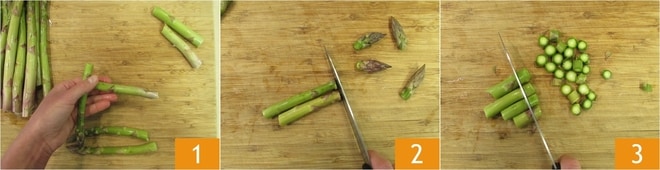 Pour préparer le risotto aux asperges, commencez par nettoyer les asperges : détachez à la main la partie la plus dure des asperges, que vous utiliserez pour le bouillon 1. Coupez les pointes des asperges 2 qui serviront à garnir le risotto et coupez en fines rondelles le reste des asperges 3.