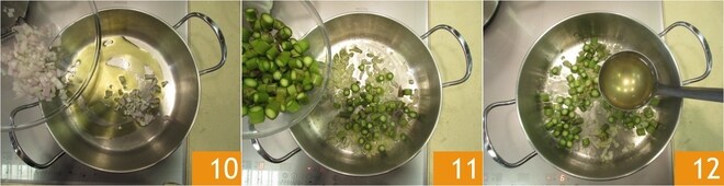 Faites revenir quelques minutes avec un filet d'huile 10, ajoutez la moitié de vos rondelles d'asperges 11, faites cuire quelques minutes en remuant de temps en temps, ajustez le sel et couvrez avec une louche de bouillon 12.
