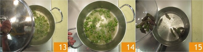 Laissez cuire environ 5 minutes avec le couvercle 13. Puis laissez refroidir 14. Blanchissez dans de l'eau salée pendant quelques minutes les pointes d'asperges 15.