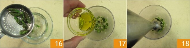 Refroidissez-les dans de l'eau glacée 16, afin qu'elles conservent une belle couleur brillante et restent croquantes. Entre-temps, les rondelles d'asperges seront tiédies, mixez-les avec 15 g d'huile 17 18.