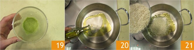 Vous devez obtenir une crème lisse et bien verte 19. Maintenant, vous avez tous les composants pour commencer la cuisson du risotto : dans une large casserole, chauffez un filet d'huile 20. Faites griller le riz pendant 3-4 minutes en ajoutant une pincée de sel 21.