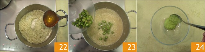 Mouillez avec le bouillon 22 jusqu'à couvrir le riz et continuez la cuisson en mouillant si nécessaire. À mi-cuisson, ajoutez les rondelles restantes d'asperges 23 et continuez à cuire le risotto en ajustant le sel si nécessaire. Gardez de côté quelques cuillères à soupe de crème 24.