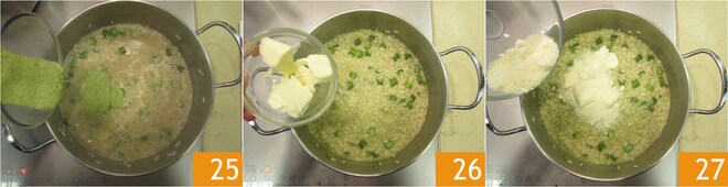 Quand il reste 2-3 minutes de cuisson du risotto, ajoutez le reste de la crème 25. Une fois la cuisson terminée, laissez reposer couvert pendant deux minutes. Incorporez le beurre 26, le fromage râpé 27.