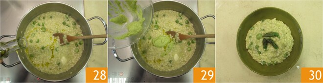 Ajoutez un tour de moulin à poivre, un filet d'huile 28 et le reste de la crème d'asperges 29, remuez vigoureusement. Servez le risotto aux asperges bien chaud en garnissant les assiettes avec les pointes d'asperge mises de côté 30.