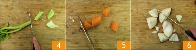 Lavez les légumes pour le bouillon, puis coupez le céleri en gros morceaux 4, les carottes 5 et l'oignon 6.