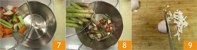 Préparez le bouillon : mettez les légumes dans une casserole 7, ajoutez également les tiges dures des asperges que vous avez mises de côté 8. Couvrez d'eau et, en partant d'eau froide, faites cuire au moins une demi-heure après l'ébullition. Épluchez et hachez finement l'échalote 9.