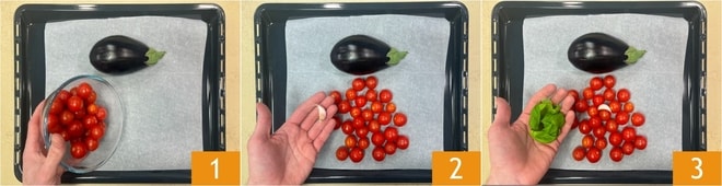 Sur une plaque recouverte de papier sulfurisé, mettez une aubergine et les tomates cerises 1, ajoutez l'ail 2 et le basilic 3.