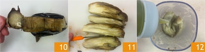 Une fois cuite, séparez la peau de la chair 10. Coupez grossièrement la chair 11, puis assaisonnez-la avec de l'huile 12.
