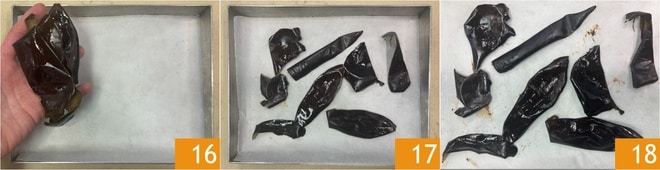 Récupérez la peau de l'aubergine 16 et disposez-la sur une plaque recouverte de papier sulfurisé 17. Séchez-la, dans un four statique, à 170°C pendant environ 10 minutes, elle doit devenir croustillante 18.