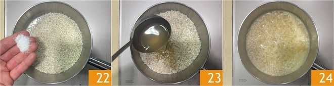Faites griller le riz carnaroli à sec avec le sel 22, puis ajoutez le bouillon de légumes 23 et terminez la cuisson 24.