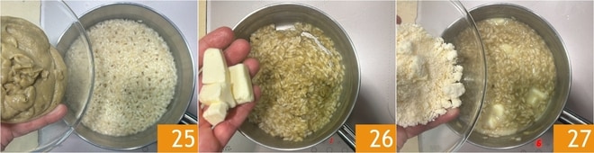 Lorsque la cuisson est presque terminée, ajoutez la crème d'aubergines 25. Éteignez le feu et liez avec du beurre 26 et du parmesan râpé 27.