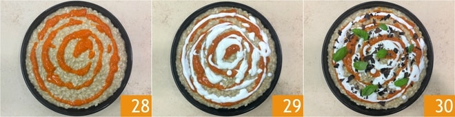 Dressez et assaisonnez avec la crème de tomates 28 et la crème de chèvre 29. Complétez avec la peau d'aubergine émiettée et quelques feuilles de basilic 30. Le risotto aux aubergines et tomates cerises est prêt à être servi.