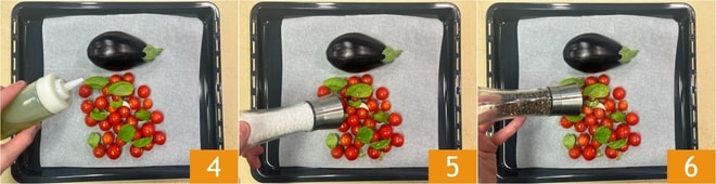 Assaisonnez avec de l'huile 4, rectifiez le sel 5 et le poivre 6. Faites cuire dans un four ventilé, préchauffé à 180°C pendant 20 minutes.
