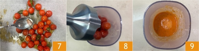 Retirez l'ail 7, récupérez les tomates et mixez-les 8 jusqu'à obtenir une sauce lisse et homogène 9. Remettez l'aubergine au four et laissez cuire, selon les mêmes modalités, pendant encore 10 minutes ou jusqu'à ce qu'elle devienne tendre.