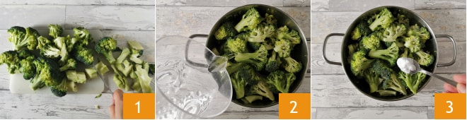 Pour réaliser le risotto aux brocolis et noix de cajou, commencez par couper le brocoli en fleurettes et réduisez la tige en morceaux 1. Rincez les brocolis et placez-les dans une grande casserole, ajoutez de l'eau jusqu'à recouvrir les légumes 2 et salez 3.