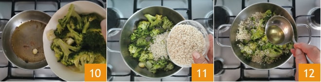 Ajoutez le brocoli cuit et bien égoutté 10. Laissez revenir pendant une dizaine de minutes. Versez le riz 11 et faites-le griller quelques minutes, puis ajoutez le bouillon de légumes une louche à la fois 12 pour amener le riz à cuisson, en remuant souvent.