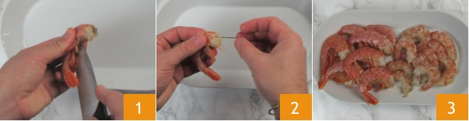 Pour réaliser le risotto aux crevettes, lime et prosecco, commencez par préparer le bouillon de légumes. Passez au nettoyage des crustacés : retirez la tête et incisez le ventre avec la pointe d'un couteau 1, puis extrayez l'intestin 2. Décortiquez la moitié des crevettes et laissez l'autre moitié avec la carapace 3.