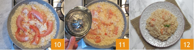Lorsque 5 minutes avant la fin de la cuisson du riz, ajoutez à la fois les crevettes décortiquées et celles avec la carapace 10, versez le jus de lime 11 et terminez la cuisson en ajoutant encore une louche de bouillon, si nécessaire. Servez votre risotto aux crevettes, lime et prosecco garni d'un zeste de lime 12!