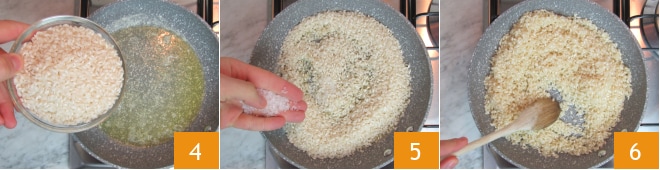 Faites fondre le beurre dans une grande poêle, puis versez le riz 4 et faites-le griller quelques minutes en ajoutant le sel 5 et en remuant en continu 6.