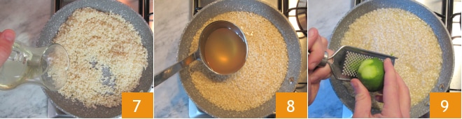 À ce stade, déglacez avec le prosecco 7 et laissez l'alcool s'évaporer complètement, puis faites cuire le riz en ajoutant une louche de bouillon à la fois 8. Pendant que le riz cuit, ajoutez le zeste râpé du lime 9, puis pressez le jus et réservez-le.
