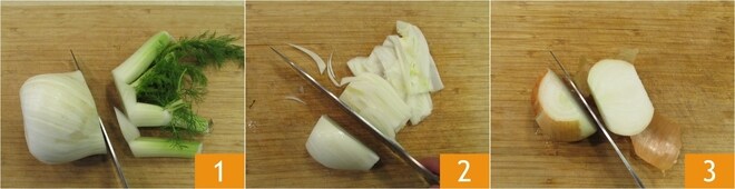 Pour préparer le risotto aux fenouils et primosale, commencez par nettoyer les fenouils en réservant les restes 1. Puis, tranchez-les finement 2. Coupez l'oignon en deux 3.