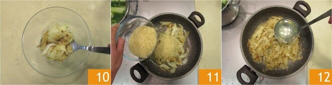 Transférez un tiers des fenouils cuits dans un bol et réservez-les pour la décoration du plat 10. Versez le riz dans la poêle avec les fenouils cuits 11, salez et faites revenir à feu vif pendant quelques minutes, puis couvrez le tout avec le bouillon préparé avec les restes 12.