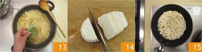 Ajoutez également les herbes aromatiques 13. Faites cuire le riz en ajoutant du bouillon au besoin pendant environ 20 minutes. Coupez le primosale en tranches 14. Dans une poêle, faites griller les amandes effilées 15.