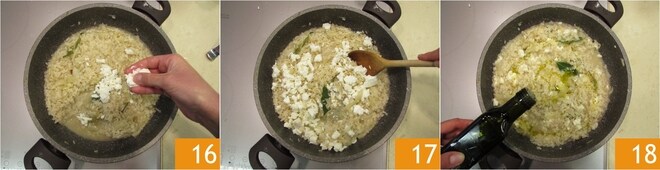 Une fois le temps de cuisson écoulé, éteignez le feu et liez le risotto avec le primosale émietté 16, mélangez 17 et terminez avec un filet d'huile 18. Dressez le plat en décorant avec les fenouils réservés, les amandes grillées et quelques feuilles de sauge. Le risotto aux fenouils et primosale est prêt à être dégusté.