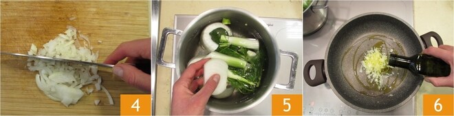 Hachez finement l'une des moitiés d'oignon 4. Versez dans une casserole remplie d'eau les restes de fenouils et l'autre moitié d'oignon 5. Portez à ébullition. Pendant ce temps, versez un filet d'huile et l'oignon haché dans une poêle 6.