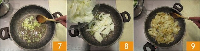 Faites revenir l'oignon pendant quelques minutes 7. Ajoutez également les fenouils tranchés 8 et faites-les sauter dans la poêle jusqu'à ce qu'ils soient dorés 9.