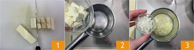 Pour réaliser le risotto aux châtaignes avec fondue de Castelmagno, commencez par préparer le beurre acide: coupez le beurre en dés 1, mettez-le dans une petite casserole, faites-le fondre à feu très doux 2 et ajoutez ensuite l'oignon haché 3. Laissez cuire pendant environ 5 minutes.
