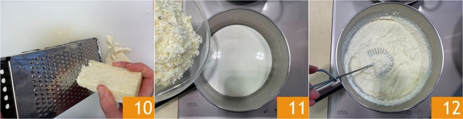 Râpez le fromage avec une râpe à gros trous 10. Chauffez la crème dans une petite casserole, à feu très doux, puis ajoutez le Castelmagno 11. Faites fondre doucement le fromage en remuant de temps en temps avec une cuillère ou un fouet 12.