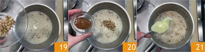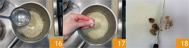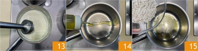 Lorsqu'il est complètement fondu, mixez avec un mixeur plongeant 13, puis versez-le dans un flacon, en réservant 2 cuillères à soupe pour lier le risotto. Laissez-le à température ambiante. Commencez la cuisson du risotto: dans une casserole, versez un filet d'huile 14 et le riz 15, puis toastez-le jusqu'à ce que les grains deviennent translucides.