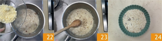 Complétez avec le Parmigiano Reggiano râpé 22, puis rectifiez le poivre et le sel. Mélangez le tout 23 et dressez l'assiette 24.