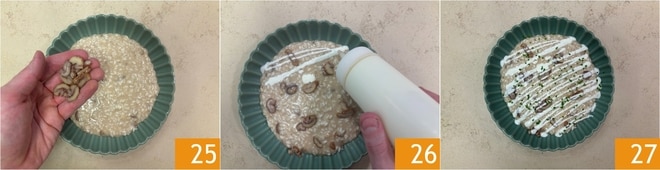 Garnissez les assiettes avec les châtaignes entières mises de côté 25, puis réalisez des filets avec le flacon de fondue de Castelmagno 26 et garnissez avec de la ciboulette hachée. Votre risotto aux châtaignes avec fondue de Castelmagno est prêt à être servi 27!