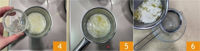 Éteignez le feu et ajoutez le vinaigre 4, puis mélangez 5 et filtrez avec une petite passoire dans un bol 6.