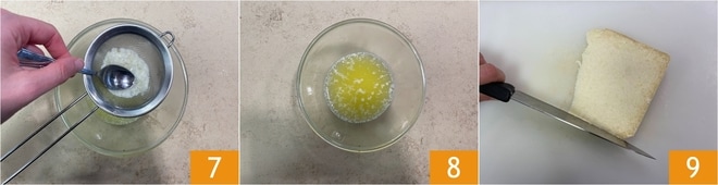 Pressez les oignons avec le dos d'une cuillère à café 7 et mettez le beurre filtré au réfrigérateur pour le faire durcir 8. Préparez la fondue: enlevez la croûte du Castelmagno 9.