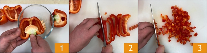 Pour préparer le risotto aux poivrons doux et crumble d'anchois, commencez par nettoyer les poivrons : éliminez les graines et les filaments internes 1 et coupez la chair d'abord en lanières 2 puis en brunoise 3.