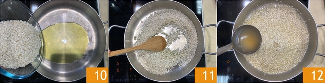 Passez au risotto : versez le riz dans une casserole avec un filet d'huile chaude 10 et faites-le griller pendant quelques minutes, en remuant souvent 11. Commencez à cuire le riz en l'arrosant d'une louche de bouillon chaud à la fois, en attendant que le liquide soit complètement absorbé avant d'en ajouter d'autre 12.