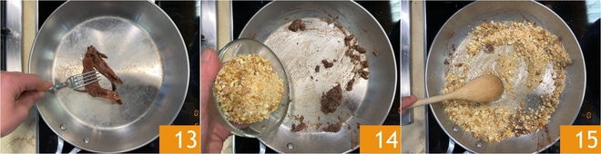 Entre-temps, faites fondre les anchois dans une autre poêle, en les écrasant avec une fourchette 13. Une fois fondus, ajoutez les miettes de pain rassis 14 et faites-les griller pendant environ 5 minutes à feu moyen-vif, en remuant souvent 15.